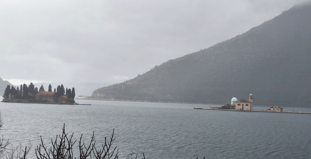 Volvimos hacia Kotor bordeando la bahía tranquilamente y parando de vez en cuando. Era una cortina de agua lo que teníamos y ni bajar del coche se podía. Teníamos una reserva en un hotel espectacular con vistas entre Kotor y Tivat, pero la montaña nos dio un aviso.