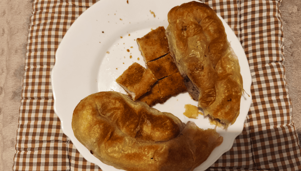 • El Burek: Compramos Burek en la pastelería para cenar en el apartamento. El burek es el «rey» del street food balcánico: una masa de hojaldre potente rellena de carne (en nuestro caso) o queso o espinacas. Al tener microondas en el nuevo alojamiento, fue la cena ideal para refugiarnos del frío.