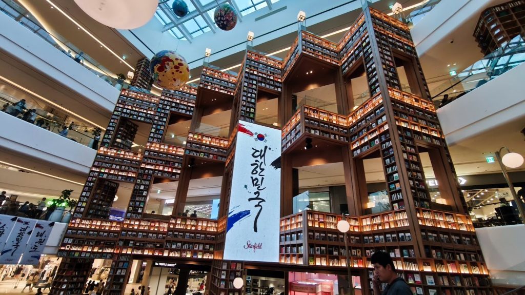 Después caminamos hacia otro centro comercial, donde visitamos la otra biblioteca Springfield y exploramos las tiendas. Justo en la salida estaban las famosas manos con la pantalla que retransmite el videoclip de Gangnam Style. Como ya dije, los subterráneos no son lo nuestro y no había forma de salir del centro comercial. Hicimos un poco el paripé con la música y ya era de noche, más de las 21h.