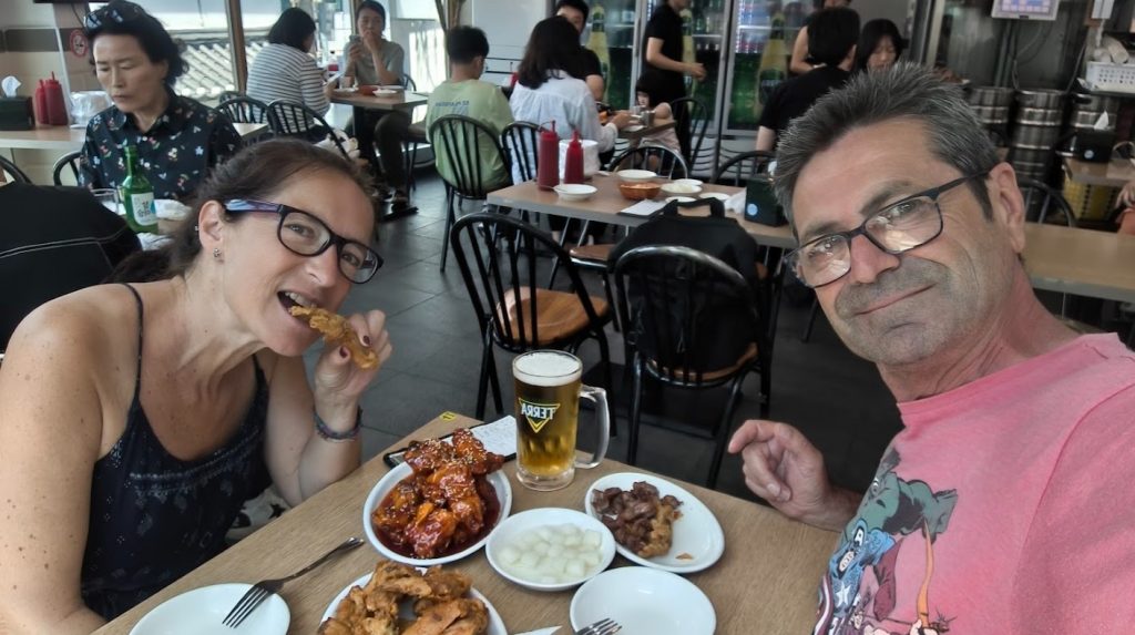 Después del palacio, fuimos hacia el sur y visitamos un templo de Buda, algo más alejado pero muy recomendable. Desde allí caminamos hacia la puerta Paldalmun, situada en una rotonda muy fotogénica. Esta zona es famosa por el pollo, así que aprovechamos para comer pollo frito mitad picante, mitad normal con cerveza (34.000 won).