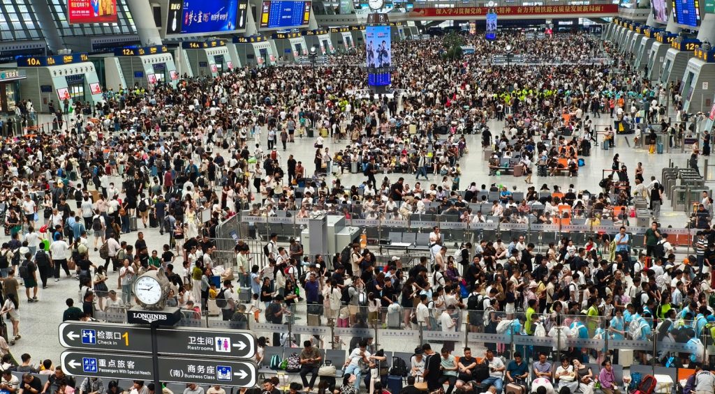 Muchos trenes ya no tenían plazas. No queríamos quedarnos a dormir allí, así que decidimos volver. Caminamos hasta encontrar un cruce despejado y pedimos un Didi por 26 yuanes. Compramos billetes para el tren de las 15:47h a Shanghái Hongqiao, sin asiento reservado, que costó lo mismo que con asiento, pero hubo que buscar un par de asientos vacíos. Era la primera opción disponible.