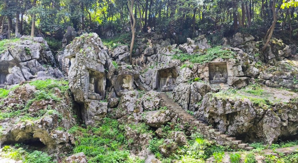 Había comprado los billetes en Trip.com, pero al no llegar al tren reservado, los cancelé y compré otros para las 8:25h. Desde Hangzhoudong tomamos un taxi hacia las grutas de Feilai Feng. El taxista tomó una ruta más larga, con tráfico y retenciones. Le dimos 60 yuanes y caminamos el último kilómetro.