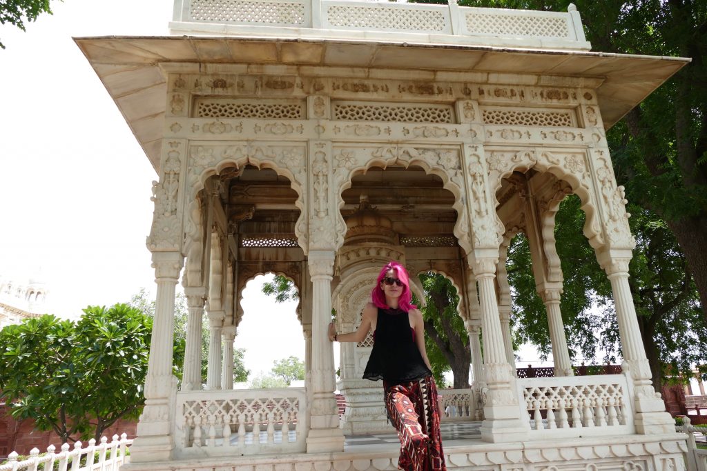 Después del Fuerte visitamos el Mausoleo Jaswant Thada, que está en la misma carretera por la que hemos llegado. Lo visitamos de vuelta. Esta es otra de las visitas imprescindibles. Es un monumento en honor del maharajá Jaswant Singh II, construido en mármol blanco. Son cerca de la una y hacemos una visita rápida.