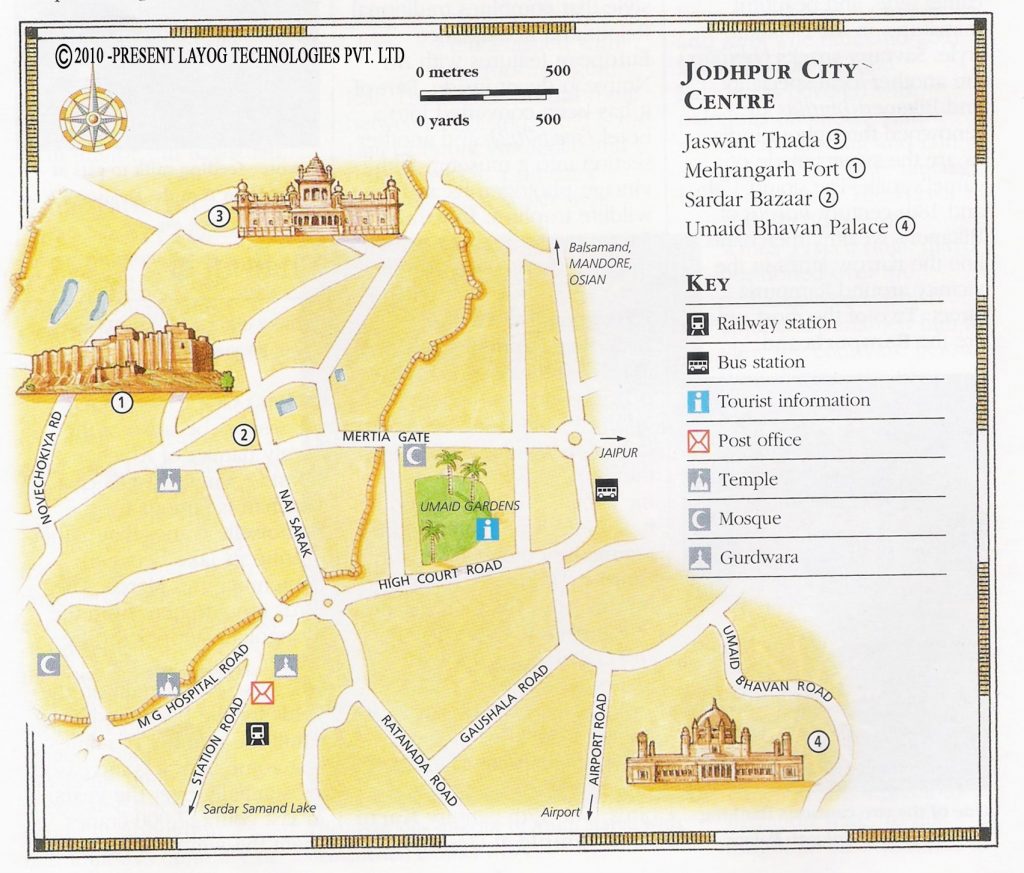 El sorprendente color azul de las fachadas de sus edificios se extiende a los pies de la fortaleza de Mehrangarh, dando paso a una estampa atrayente como pocas. Aunque en un primer momento se trataba de viviendas ocupadas por brahmanes, se acabó adoptando esta tonalidad que, según se dice, asusta a los mosquitos y protege del calor. Por este motivo se conoce con el apodo de la «ciudad azul». Las mejores vistas se obtienen, por supuesto, de la parte alta del fuerte, que permite observar los alrededores y distinguir hasta donde abarca la parte antigua de la ciudad.