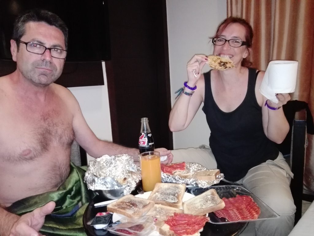 Queríamos cenar algo pero damos una vuelta a ver si encontramos comida para llevar y los chiringuitos que hace un rato estaban abiertos, ahora ya están cerrados. Así que tiramos del embutido que hemos traído para emergencias. Y con esto terminamos. Mañana cumpleaños y sorpresa!!
