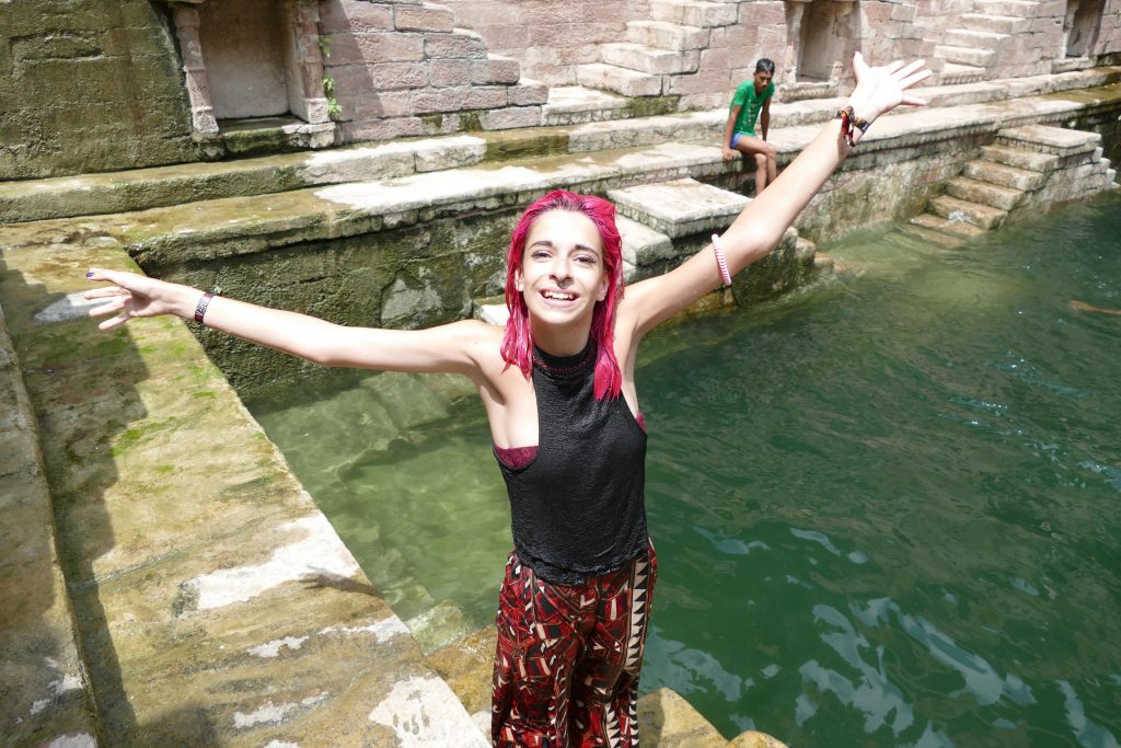 Vamos al Stepwell, donde hay unos niños bañándose. El agua está muy limpia. Hace mucho calor y la cabra loca de nuestra hija se quiere bañar. Ya nos convence para que nos bañemos todos. Como no llevamos ropa de baño, nos metemos con ropa. Qué experiencia tan buena y el agua estaba fresquita. Como cualquier cosa que haces en la India, enseguida hay mucha gente arriba mirando cómo nos bañamos. Los más atrevidos saltan al agua desde una buena altura. Yo con bañarme ya tengo suficiente. Ha valido la pena este rato de recreo.