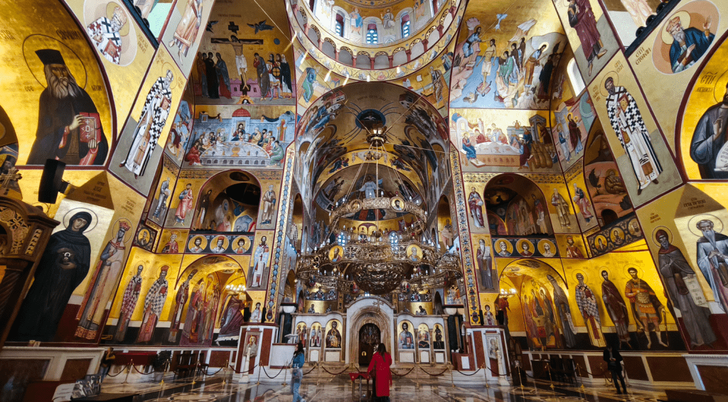 Es una de las catedrales ortodoxas más grandes de los Balcanes. Aunque no nos impresionó tanto como la de Belgrado (el interior no tiene mosaicos en las paredes, solo en el suelo con una representación del Arca de Noé), su exterior de piedra tosca y sus enormes campanas son dignas de ver. Llegamos hacia las 15h.