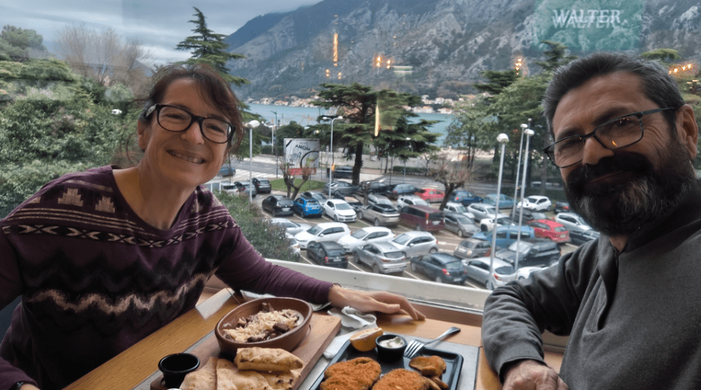 De vuelta a Kotor, comimos en el centro comercial Kamelija, en el restaurante Walter. Fue un acierto total: tiras de ternera con salsa de queso y una escalopa muy tierna. Comida reconfortante ideal para un día gris.