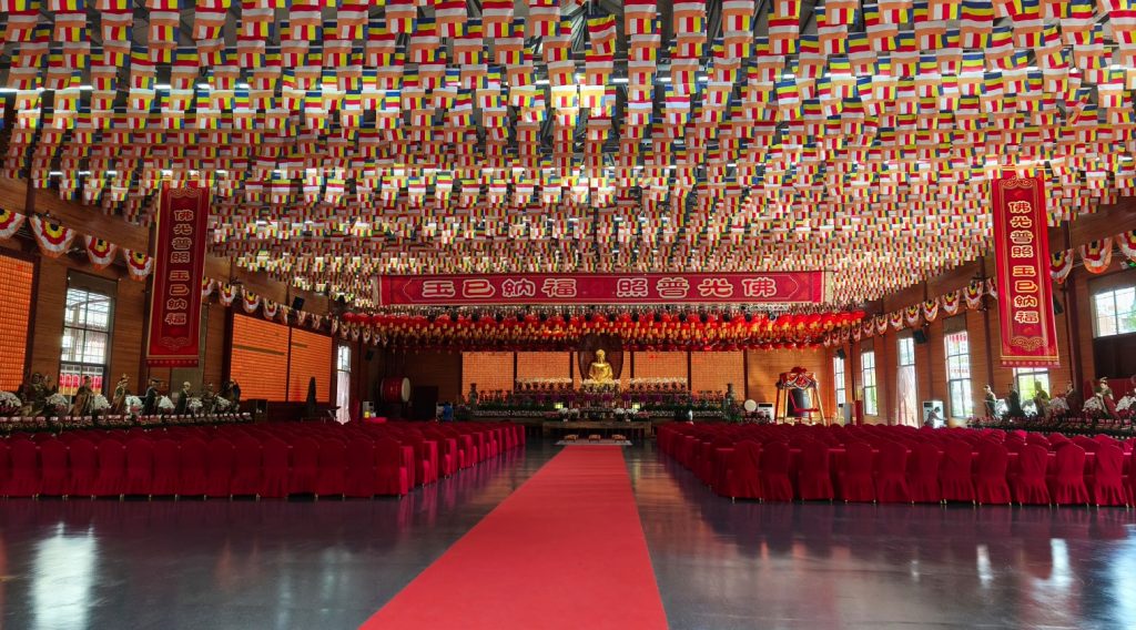 Nos sorprendió la cantidad de flores perfectamente cuidadas, el jardinero llegaba con un carrito repleto de ramos y plantas. La sala principal es inmensa, con capacidad para más de 200 personas y numerosas estatuas. Además, el recinto cuenta con tienda, restaurante, estanque con patos, una pagoda y espectaculares tallas de madera. ¡Una visita muy completa! Estuvimos alrededor de una hora disfrutando de cada rincón.